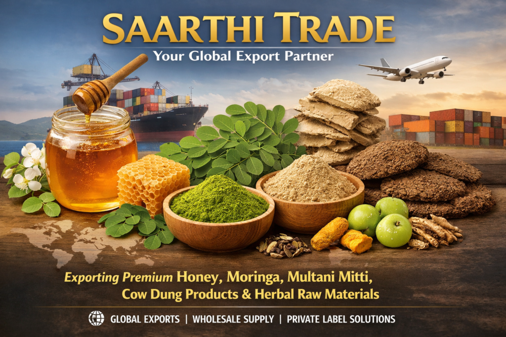 Saarthi Trade is a professional export from India company supplying premium honey, moringa, Multani Mitti (Fuller’s earth), cow dung products and herbal raw materials to global buyers, importers, wholesalers and private-label brands.